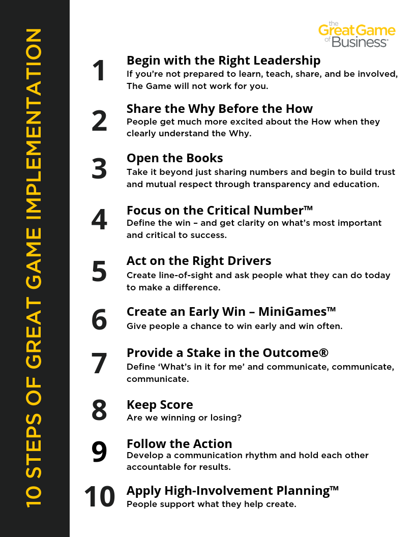 In more than 35 years practicing The Great Game of Business® at SRC, as well as three decades helping thousands of companies implement The Game in their own companies, we have determined the fastest, most efficient and most reliable path to Rapid Financial Results and Lasting Cultural Change™ follows a set process. We honed and developed the 10-Step Approach to GGOB Implementation to guide companies implementing The Great Game of Business in their organizations.